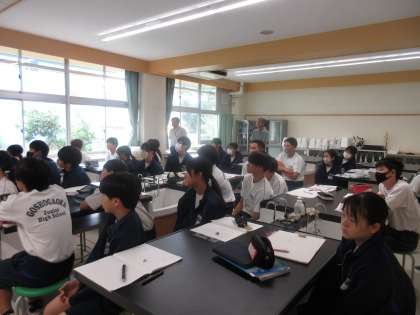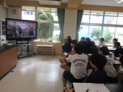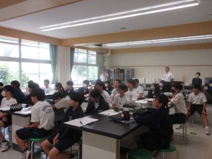 理科室を訪ねた時は、「ソメイヨシノのひみつ」について、スライドや動画を活用して探っているところでした。ソメイヨシノの遺伝子がクローンのようなものだと言うことから、無性生殖や有性生殖へとイメージを広げる生徒たちです。(学校運営協力員の皆様が授業参観をしてくださっています。)