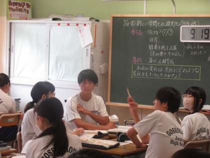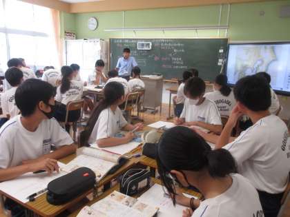 7月18日(木)今日の授業風景 その5 公開日 2024/07/18 更新日 2024/07/18 お知らせ 2年生の社会科の授業です。 「社会の変化は文化にどのような変化をもたらしたか」をテーマに学習を進めていました。教室を訪ねたときは「伊能忠敬」の測量方法を代表の生徒と実際に行い、イメージを膨らませる場面でした。伊能忠敬の工夫や苦労がたくさん想像できてしまいます。笑顔で学習に取り組む生徒たちです。