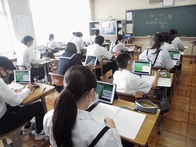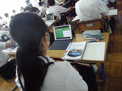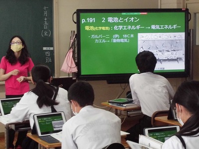 3年生の理科の授業です。科学分野です。今日は,電池とイオンについて学んでいます。タブレットを活用し,画面を共有しながら授業が進みます。