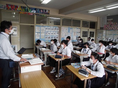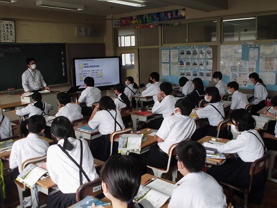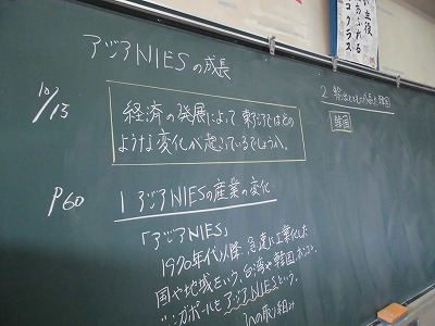 1年生の社会の授業です。地理分野です。今日は,経済の発展によって東アジアではどのような変化が起こっているかについて,教科書や資料をもとに考えています。