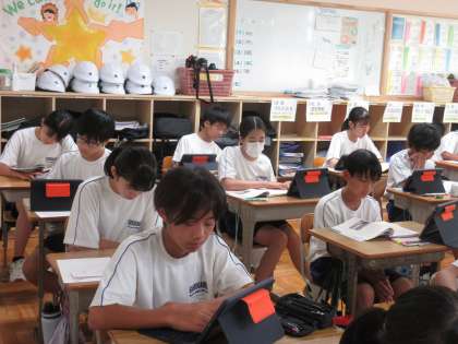 教材文「碑」の文章を読んでいるところでした。今日の課題は「文章を読み、感じたことや考えたことを書く。」です。文章をしっかり目で追う姿が印象的でした。