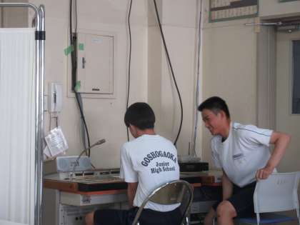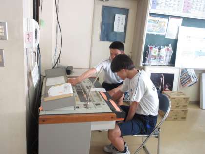 給食の時間を利用して、図書委員会の生徒が「夏休みに借りた本の返却」について放送での連絡を行っていました。現在、仮の校長室に放送施設があるため、生徒たちは仮校長室からの放送です。さすが、3年生!しっかりやりとげていました!