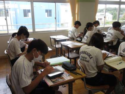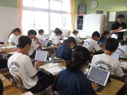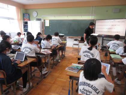 タブレットに映し出された英文の間違えを見つけ、正しい文にする活動に取り組んでいました。これまでの学習を振り返り、正確な文の完成を目指す生徒たち。集中して取り組んでいました。タブレットへの書き込みもスムーズです!