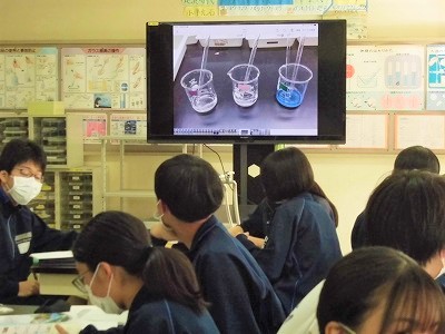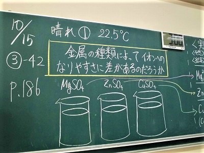 3年生の理科の授業です。科学分野です。今日は,金属の違いによってイオンへのなりやすさに差があるかについて学んでいます。予想を立てた後,実験になります。ipad活用で様々な授業方法の幅が広がっています。
