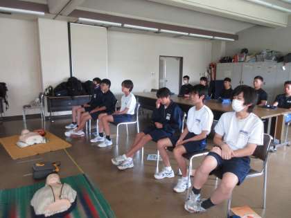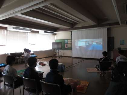 消防署での職場体験の様子です。心肺蘇生法の体験の前に消防署の役割を学んでいます!