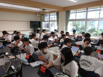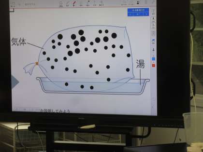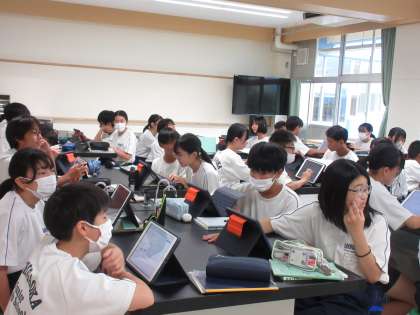 8月29日(木)今日の授業風景 その3 公開日 2024/08/29 更新日 2024/08/29 お知らせ 1年生の理科授業です。 「状態によって堆積や質量は変わるか」をテーマに学習を進めていました。タブレットに自分なりの予想をかき、考えを交流する生徒たち。自分なりの考えを積極的に表現する生徒たち。頑張っていました!