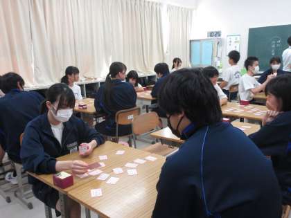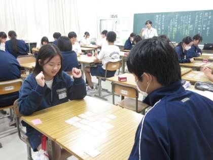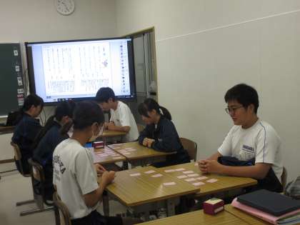 9月6日(金)今日の授業風景 その10 公開日 2024/09/06 更新日 2024/09/06 お知らせ 3年生の国語科の授業です。 万葉集・古今和歌集・新古今和歌集の学習も一段落し、今日はペアで「百人一首」にチャレンジしていました。担当の先生の和歌を読む声にあわせ、札を取り合う生徒たち。笑顔で取り組む姿が印象的でした。