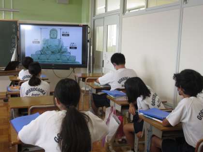 9月10日(火)今日の授業風景 その1 公開日 2024/09/10 更新日 2024/09/10 お知らせ 1年生の社会科の授業です。 「大仏のひみつ」について、クラス全体で考えを交流していました。電子黒板に映し出される資料を見て、大仏へのイメージを広げる生徒たちです。これから学習する時代のイメージが広がっていました!
