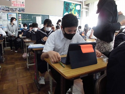 2年生の英語の授業です。DMMを活用し,ネイティブの方との英会話を楽しんでいます。オンラインは授業の幅を広げてくれています仲間達も一生懸命英語で会話しています。