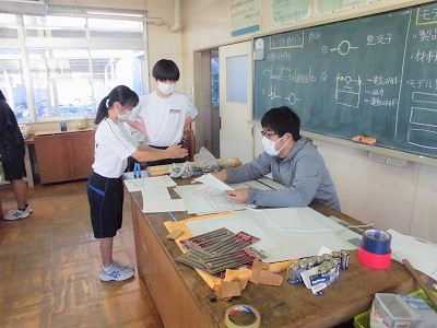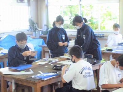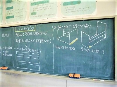 1年生の技術科の授業です。木工製作に取り組んでいます。自分だけの本棚を設計しています。今日は,設計をもとに方眼紙でモデルを作製しています。みんな頑張っています。