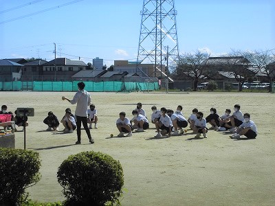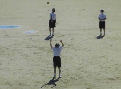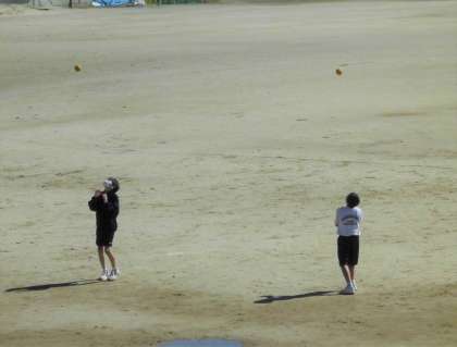1年生の保健体育の授業です。球技:ベースボール型のソフトボールに取り組んでいます。今日は,ボールを投げる・受けるについて学んでいます。基本的な技能を丁寧に学んでいます。