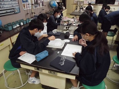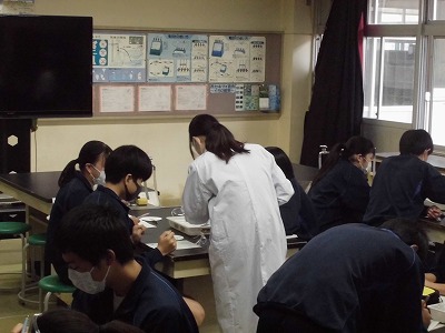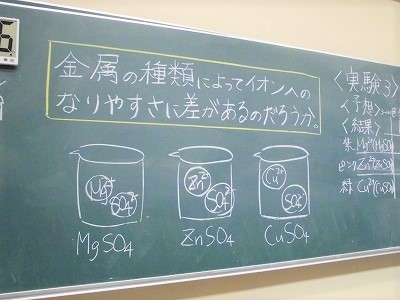 3年生の理科の授業です。科学分野です。実習生が授業をしています。今日は,金属の違いによってイオンへのなりやすさはあるかどうかを実験を通して検証しています。