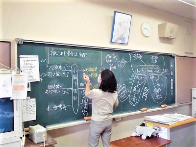 2年生の理科の授業です。生物分野です。今日は,消化酵素の働きについて学んでいます。実感を伴う理解に近づけるように,板書を工夫しています。