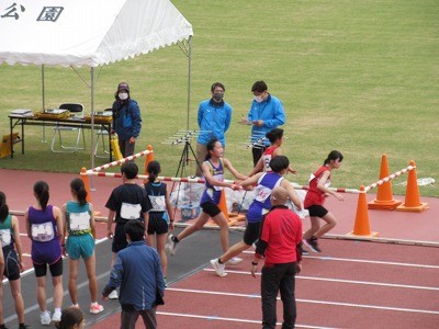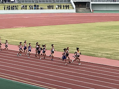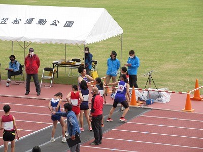 笠松運動公園陸上競技場及び公園内周回コースで行われました。今年度は競技場内でスタートとゴールでした。チーム御所ケ丘も参加です。第1走者,力走を重ね10位以内で襷を第2走者へと繋ぎます。第3走者もしっかり走りました。