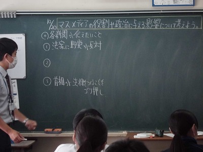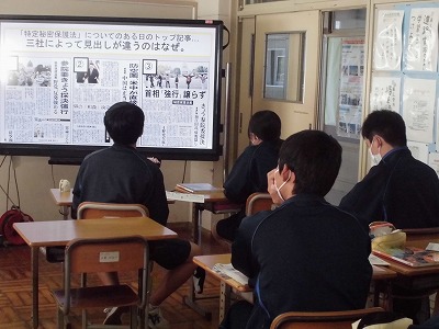 3年生の社会の授業です。公民分野です。今日は,マスメディアの働きや政治に与える影響について,3社の同内容の新聞記事を比べながら思考しています。