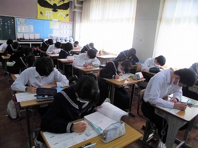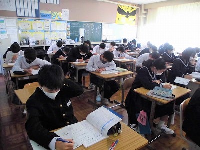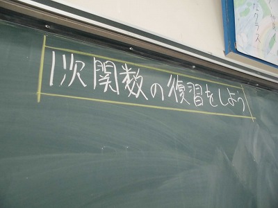 2年生の数学の授業です。今日は,一次関数の学びのまとめとして様々な問題を解いています。頑張ってます!