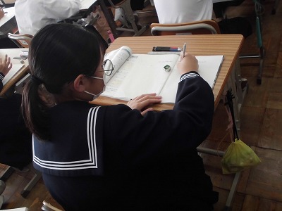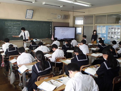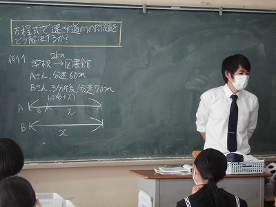 1年生の数学の授業です。速さや道のりの問題を方程式でどのように解決したらよいかについて考えています。みんな一生懸命取り組んでいます。頑張れ!