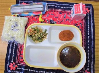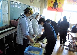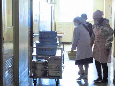 3年生,給食準備・配膳の様子です。静かにスムーズに配膳が進みます。今日の献立は「ソフトめん,カレーうどんスープ,野菜コロッケ,胡麻和え,牛乳」です。