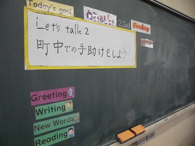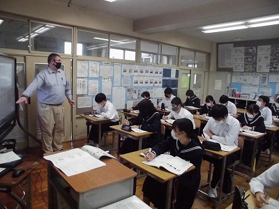 3年生の英語の授業です。今日は,町中で手助けするための表現について学んでいます。まずはALTから表現の活用方法と例について説明を聴いています。