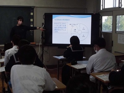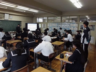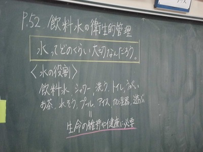 3年生の保健体育の授業です。保険の内容です。今日は,飲料水の衛生的な管理について学んでいます。資料を活用し,仲間達の意見を確認しながら授業が進みます。