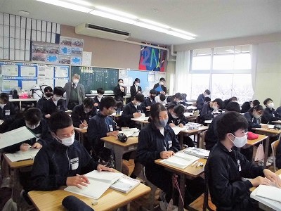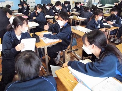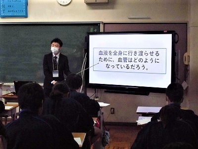 2年生の理科の授業です。実習生の研究授業です。生物の体のつくりとはたらきの単元です。今日は,血液と血管の構造とその役割について理解する授業です。学習課題を提示し,本時の内容をしっかり確認してから学びに入りました。工夫したワークシートに先生が説明したポイントを記入していきます。思考を促す場面では,仲間と話し合いを進めました。先生の柔らかく丁寧な口調に仲間達は真剣に耳を傾けていました。電子黒板を活用し,見えない部分をよりわかりやすくするための資料提示が出来ていました。仲間達もよりよく理解できていました。素晴らしい!
