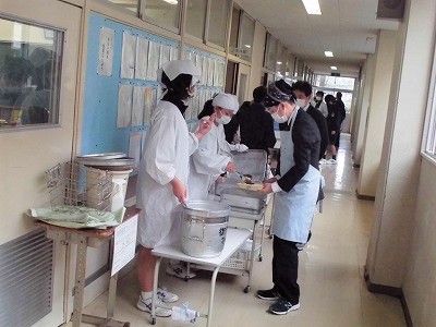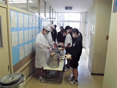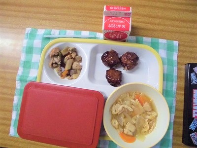 2年生の給食準備・配膳の様子です。整然と準備・配膳が進みます。今日の献立は「ごはん,たれ付き肉団子(中学生3個),筑前煮,石狩汁,牛乳」です。