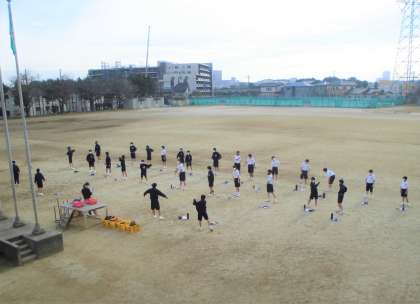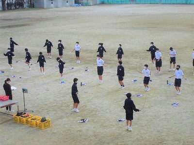 授業の様子1 公開日 2021/10/25 更新日 2021/10/25 お知らせ 1年生の保健体育の授業です。球技:ソフトボールです。授業の導入時は,準備運動,そして体力アップのための補助運動で「縄跳び」に取り組んでいます。