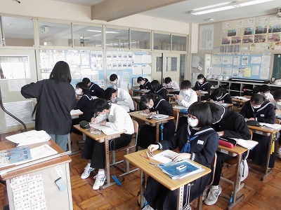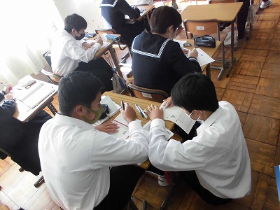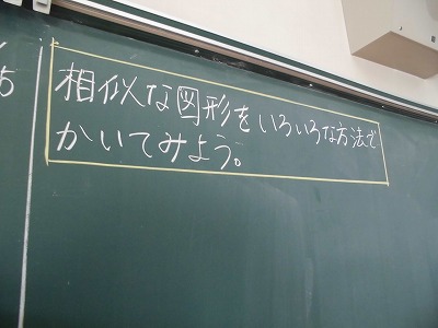 3年生の数学の授業です。今日は,相似な図形を様々な方法で書いています。仲間と協働しながらの学びです。