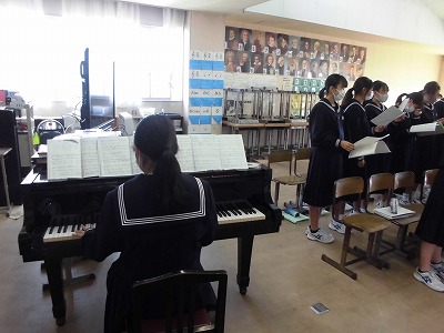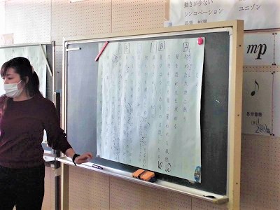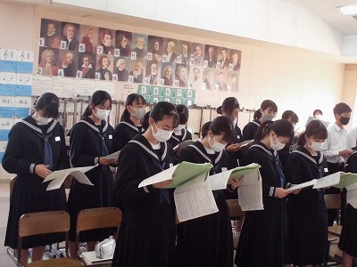 2年生の音楽の授業です。合唱に取り組んでいます。オンライン授業で覚えた符号を読み取りながら,マスクを着用し一方向にて歌っています。