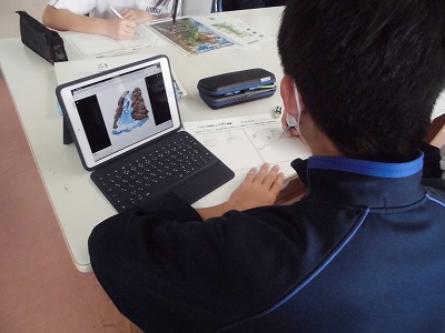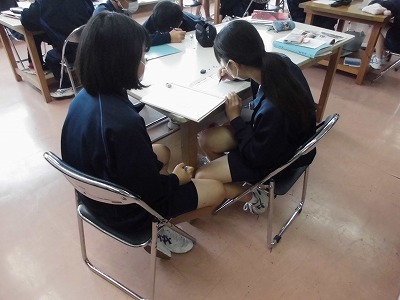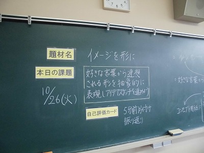 3年生の美術の授業です。今日は「イメージを形に」との単元で,好きな言葉から連想される形をスケッチしています。仲間とアイディアを共有しながら取り組んでいます。