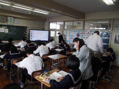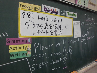 3年生の英語の授業です。今日は,グラフや表を活用して英文でレポートを作成することに取り組んでいます。みんな一生懸命に取り組んでいます。