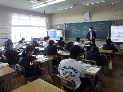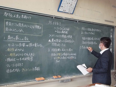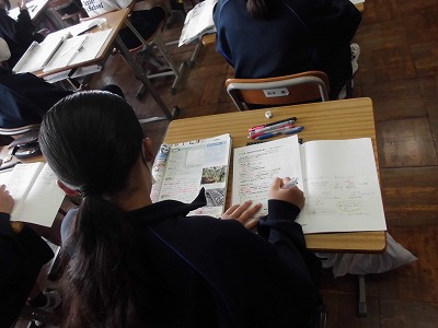 1年生の社会の授業です。世界地理です。今日は,東南アジアの経済はどのような課題があるかについて考えています。見えない国の経済を見えるようにするのはグラフや表等の資料です。しっかり読み取って思考してほしいと思います。