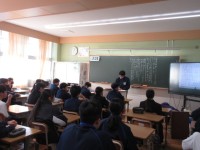 1年生の理科の授業です。今日は,水溶液から溶質を取り出すためにはどうしたらよいか?ということの予想を立てて,実験を行います。その前に,実験のやり方について先生が解説しています。みんな真剣に耳を傾けています。これから実験です。