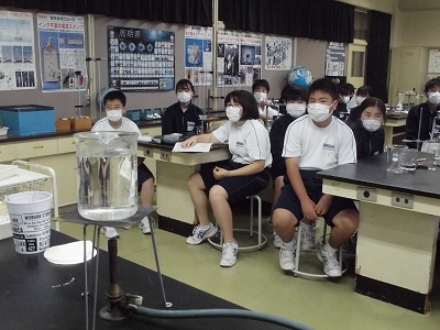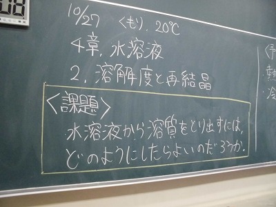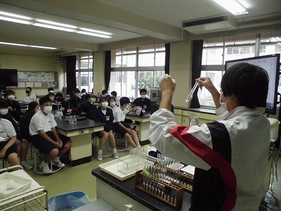 1年生の理科の授業です。今日は,水溶液から溶質を取り出すためにはどうしたらよいか?ということの予想を立てて,実験を行います。その前に,実験のやり方について先生が解説しています。みんな真剣に耳を傾けています。これから実験です。
