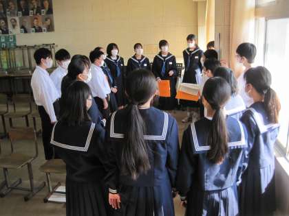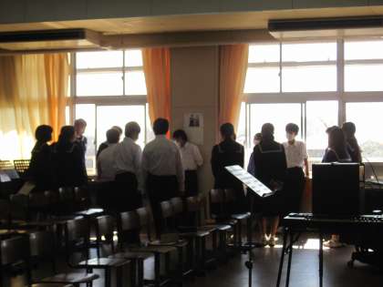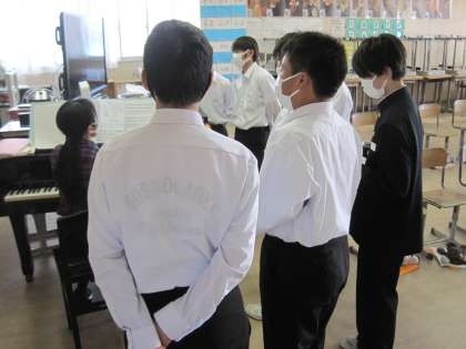 1年生の音楽の授業です。合唱コンクールに向けて、練習中です。パートごとに分かれて頑張っています。