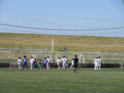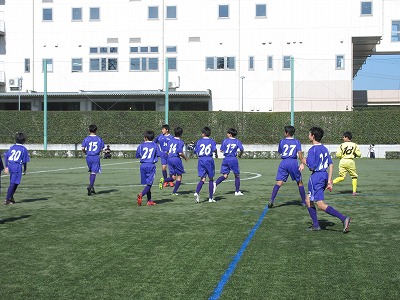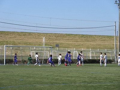 サッカー競技は,常総運動公園自由広場での開催です。チーム御所ケ丘は愛宕中との対戦です。序盤,ボールが足に付かず,堅さが見られましたが,徐々にパスがつながってきます。引水タイム前あたりから,相手ゴール付近での攻防が出てきました。引水タイム後に1点,そして前半終了間際に1点をいただき,2−0で前半を折り返します。