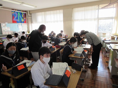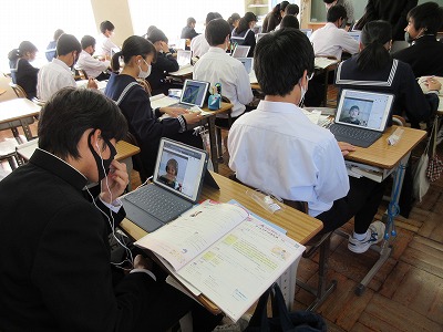 2年生の英語の授業です。DMMを活用した授業の2時間目です。今日は,日本の習慣やマナーについて伝えたり,外国の習慣やマナーに尋ねたりすることが学習課題です。画面越しですが,ネイティブとしっかり会話しています。頑張ってます!