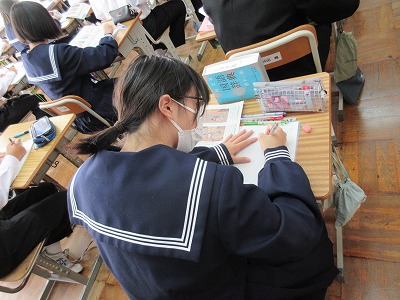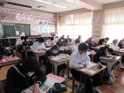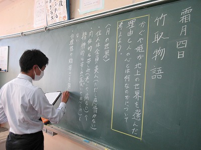 1年生の国語の授業です。古典,竹取物語についての学びです。今日は,かぐや姫が地上の世界を選んだ理由と人の心について考えています。頑張れ!