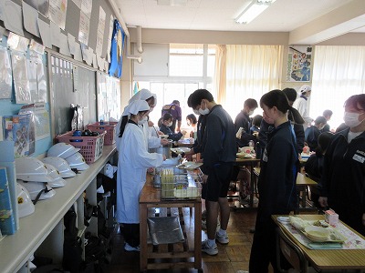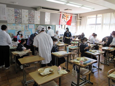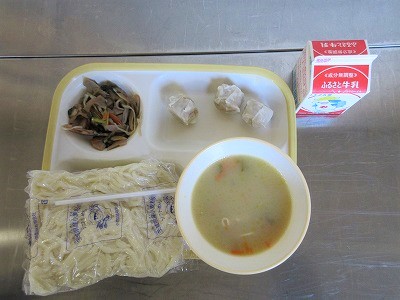 3年生の給食準備・配膳の様子です。とてもスムーズに流れています。「静かに」です。今日の献立は「ソフトめん,とんこつラーメンスープ,シュウマイ(3個),根菜のピリ辛炒め」です。