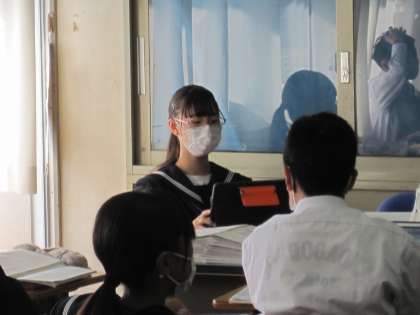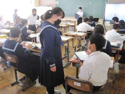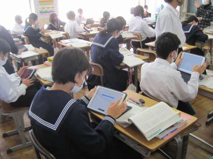 授業の様子3 公開日 2021/11/05 更新日 2021/11/05 お知らせ 1年生の国語の授業です。竹取物語を暗唱し,iPadで撮影したものを先生に送りました。「今は昔,竹取の翁という者ありけり。・・・」とみな練習を頑張り,暗唱することができました。