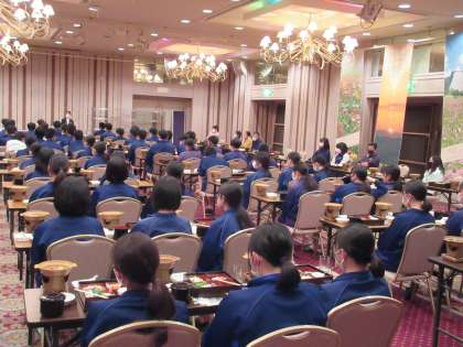 普段は結婚式を行う大広間に,全員が一方向を向いての夕食はある意味壮観でした。全体でのごちそうさまの様子です。このあとは,自由時間となり,20:00から食事会場で「赤べこ体験」が始まります。