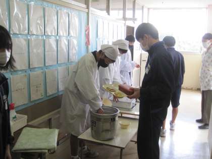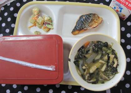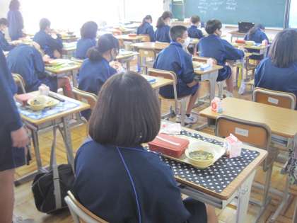 給食の時間です 公開日 2021/11/08 更新日 2021/11/08 お知らせ 2年生の給食準備・配膳の様子です。手際よく準備を進めています。今日の献立は「ごはん,鯖の文化干し,豆とさつまいものサラダ,五目みそ汁」です。