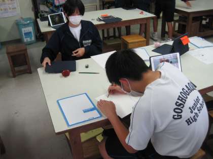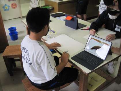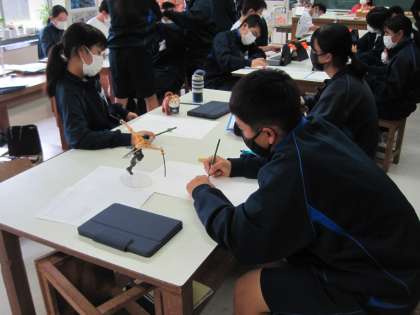 授業の様子2 公開日 2021/11/09 更新日 2021/11/09 お知らせ 1年の美術の授業です。家から持ってきたフィギュアやぬいぐるみなどをデッサンしました。野菜は置いておけないので,持っていたときにiPadでさまざまなアングルから撮影しておき,それを見ながら描いていました。