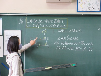 3年生の数学の授業です。今日は,三角形の一辺に平行な直線を引いた図形について考えています。まずは自分の考えを検討し,その後仲間と考えを共有しています。