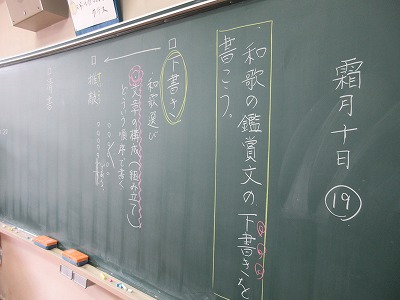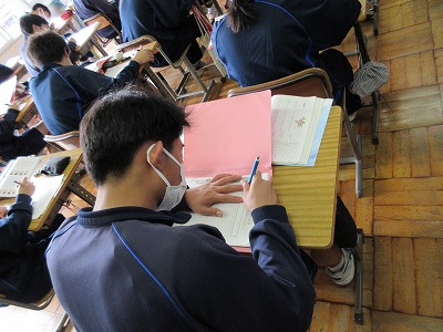3年生の国語の授業です。今日は,和歌についての鑑賞文の下書きを書いています。みんな真剣です。頑張れ!