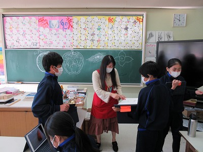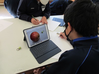 1年生の美術の授業です。デッサンをしています。まずは果物の実物に触れ,立体感を体感した上で,タブレットで示した果物の画像を見ながらデッサンをしています。みんな上手に描いています。頑張ってます!