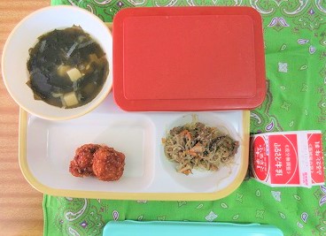 1年生の給食準備・配膳の様子です。当番を中心に手際よく出来ています。素晴らしい。今日の献立は「ごはん,ヤンニョムチキン(2個),チャプチェ,わかめスープ、牛乳」です。
