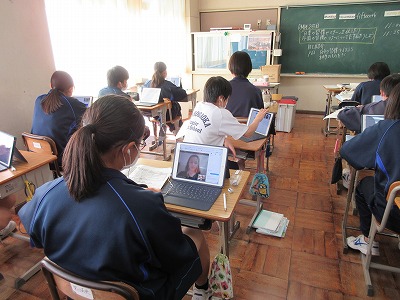 2年生の英語の授業です。今日は,DMMを活用した授業です。今日は,オンラインでネイティブの先生と「日本の習慣やマナーを伝えたり,外国の習慣やマナーについて尋ねたりする」ことが学習課題です。それぞれがもっている英語力でネイティブの先生に熱心に日本の習慣やマナーについて伝えています。みんな頑張ってます!