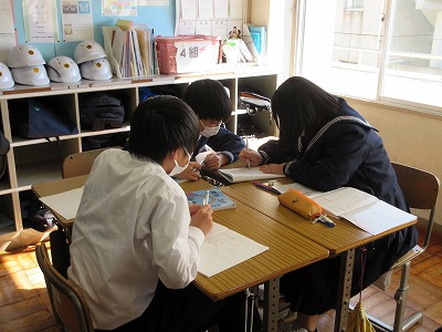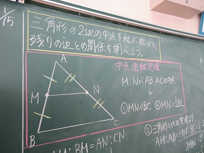 3年生の数学の授業です。今日は,三角形の二辺の中点を結ぶ線分と残りの辺との関係性について調べています。まず自分で考え,その後グループでそれぞれの意見を述べ合い,学びを共有しています。