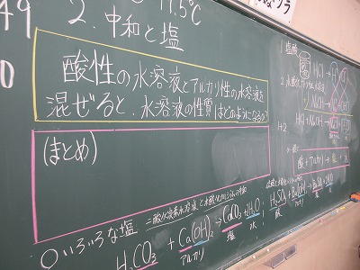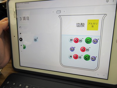3年生の理科の授業です。科学分野です。今日は,酸性の水溶液とアルカリ性の水溶液を混ぜると水溶液はどのような水溶液になるかについて考えています。タブレットのジャムボード機能を活用して自分の考えを表現しています。たいへんわかりやすいです。